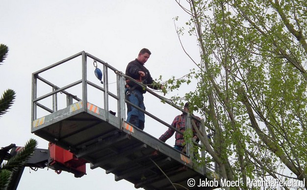 Geert Moed en Gerard Panjer gingen vanuit een verreiker van Van der Ven Verhuur uit Ter Apel de boom te lijf. En met succes...