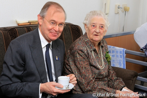 Kamerheer van de Koning drs. Jaap Wolters naast de 94-jarige Johanna Harms-Franzen