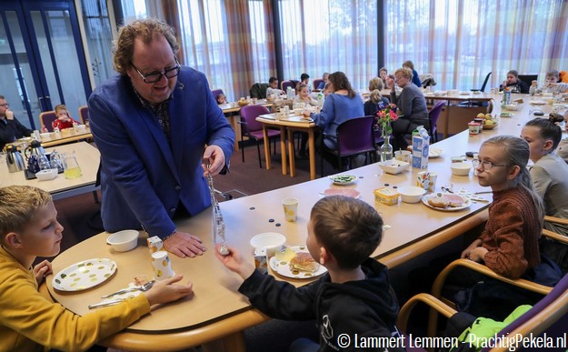 Leerlingen basisschool Sint Willibrordus ontbijten samen met burgemeester Jaap Kuin - Foto's Lammert Lemmen
