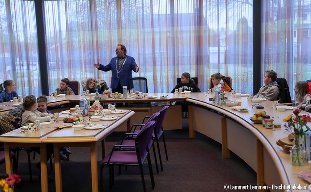 OUDE PEKELA - Leerlingen van basisschool Sint Willibrordus genoten vanmorgen van een speciaal ontbijt in de raadzaal van het gemeentehuis, samen met burgemeester Jaap Kuin en locoburgemeester Ellen van Klaveren. Burgemeester Kuin toonde de kinderen zelfs de ambtsketen van dichtbij, wat zorgde voor een bijzonder moment.