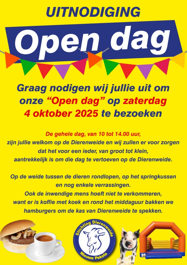 NIEUWE PEKELA - De Stichting Dierenweide Nieuwe Pekela nodigt iedereen van harte uit voor de Open Dag op zaterdag 4 oktober 2025. Tussen 10.00 en 14.00 uur is jong en oud welkom om een kijkje te nemen bij de dieren en te genieten van een gezellige dag in de buitenlucht.