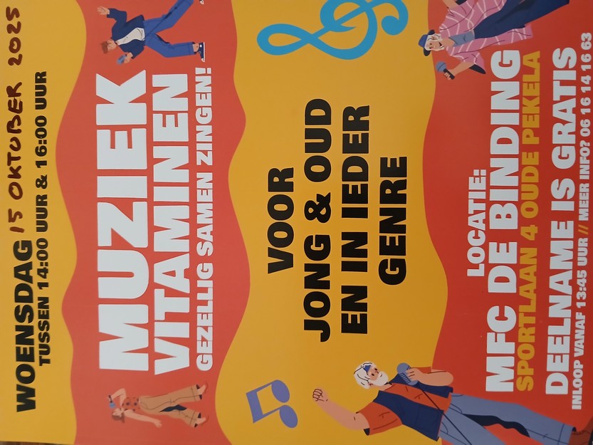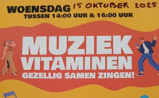 OUDE PEKELA - Op woensdag 15 oktober 2025 is het weer zover: de maandelijkse editie van Muziek Vitamines vindt plaats in MFC De Binding (Sportlaan 4, Oude Pekela). Tussen 14:00 en 16:00 uur bent u van harte welkom om samen te zingen, herinneringen op te halen én nieuwe energie op te doen. De inloop is vanaf 13:45 uur. Deelname is gratis.