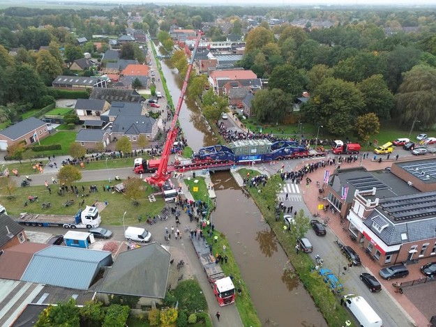 Het transport bewoog zich met een kruissnelheid van nog geen tien kilometer per uur. Overal langs de route stonden mensen klaar met camera’s en telefoons. Vooral in Nieuwe Pekela was de belangstelling enorm: daar stond het bij de Onstwedderbrug zwart van de mensen. Gelukkig was daar tijd genoeg om het megagevaarte van dichtbij te zien. Want hoewel de colonne rond 11 uur al voor de brug stond, was die brug pas rond 13.00 uur compleet gepasseerd.