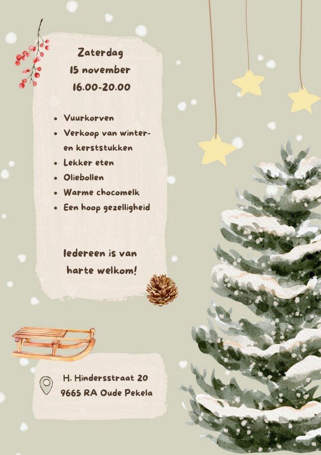 OUDE PEKELA - De winter staat voor de deur en dat betekent dat het tijd is voor gezelligheid, warmte en samen genieten. Op zaterdag 15 november wordt bij de Julianakapel in Oude Pekela een sfeervolle Winterfair georganiseerd. Bezoekers zijn van harte welkom tussen 16.00 en 20.00 uur aan de H. Hindersstraat 20.