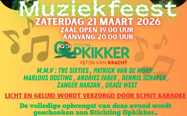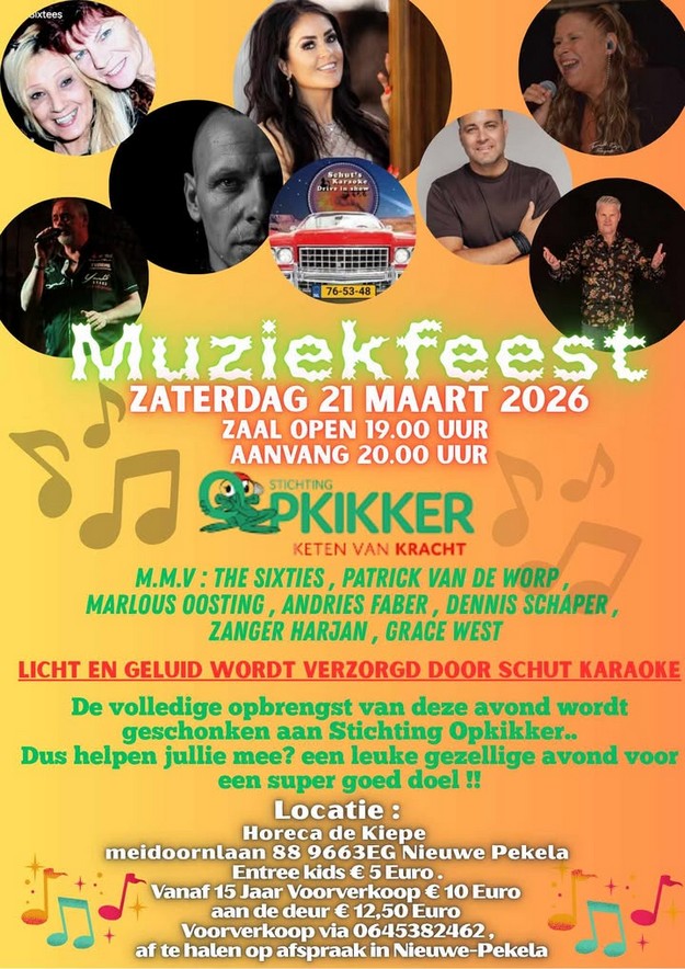 NIEUWE PEKELA - Op zaterdag 21 maart 2026 wordt in De Kiepe in Nieuwe Pekela een groot muziekfeest gehouden voor het goede doel. De volledige opbrengst van de avond wordt gedoneerd aan Stichting Opkikker, die zich inzet voor gezinnen met een langdurig ziek kind.