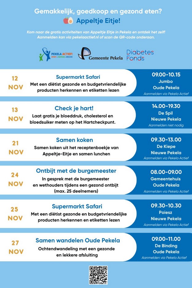 Zo kunnen inwoners op 12 en 25 november samen met een diëtist op Supermarkt Safari: een rondleiding langs gezonde én betaalbare producten in de supermarkt. Op 24 november nodigt burgemeester Jaap Kuin inwoners uit voor een gezamenlijk ontbijt in het gemeentehuis. ‘Gezond leven begint met kleine, gezonde keuzes die je elke dag herhaalt. Bijvoorbeeld met een goed ontbijt,’ aldus burgemeester Kuin.