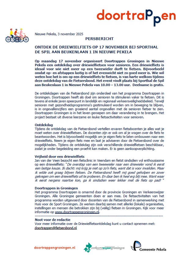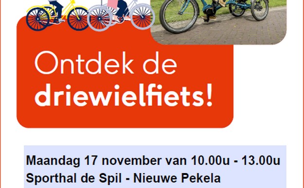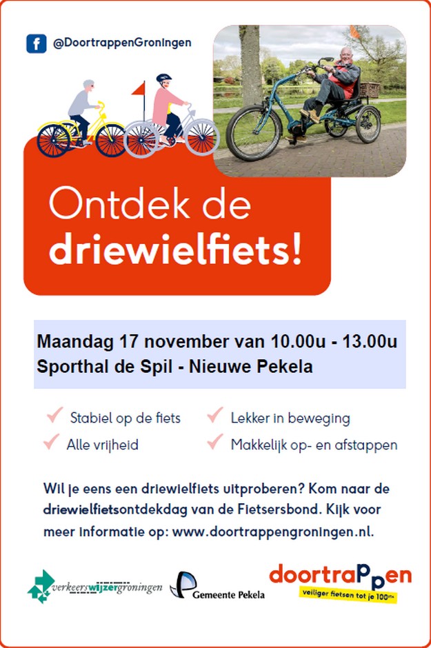 NIEUWE PEKELA - Namens de Fietsersbond zijn wij verheugd u te informeren over de ‘Driewielfietsontdekdag’ in Nieuwe Pekela, dat plaatsvindt op maandag 17 november bij Sporthal de Spil in Nieuwe Pekela.
