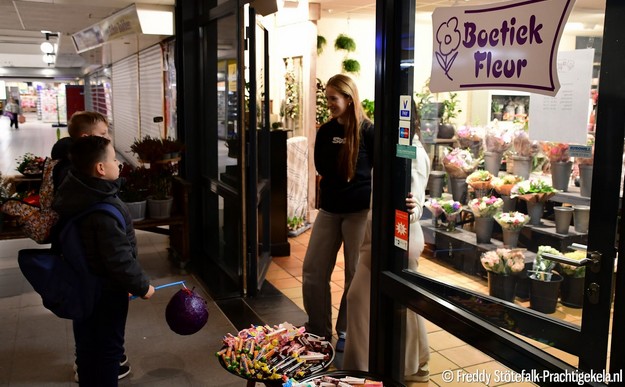 Rond het winkelcentrum De Helling was het een gezellige drukte. De kinderen werden daar met open armen ontvangen door winkelmedewerkers en voorbijgangers die genoten van de levendige sfeer.