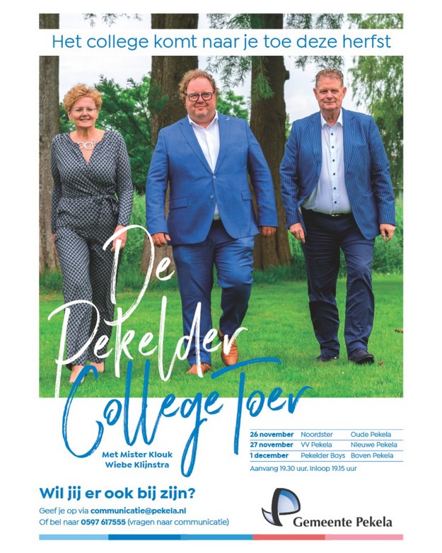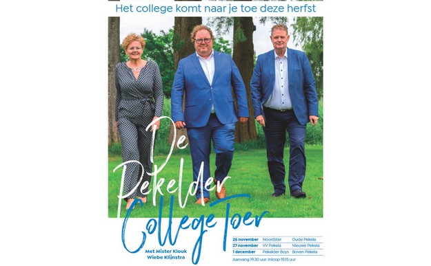 PEKELA - Het gemeentebestuur van Pekela trekt deze herfst Pekela in met de College Toer. Tijdens drie avonden krijgen inwoners de kans om rechtstreeks in gesprek te gaan met burgemeester Jaap Kuin en de wethouders Ellen van Klaveren en Reiny Kuiper.