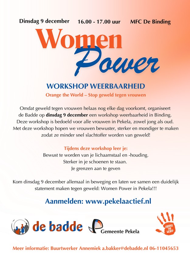 Op de een-na-laatste dag van de campagne wordt een weerbaarheidstraining voor meisjes en vrouwen aangeboden. De training ‘Women Power’ vindt plaats op dinsdag 9 december van 16.00 tot 17.00 uur in MFC De Binding in Oude Pekela. Wethouder Ellen van Klaveren is hierbij aanwezig.