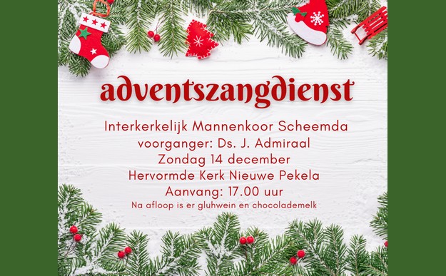 NIEUWE PEKELA - In de Hervormde Kerk van Nieuwe Pekela vindt op zondag 14 december een adventszangdienst plaats. De dienst wordt georganiseerd met medewerking van het Interkerkelijk Mannenkoor Scheemda en de voorganger is Ds. J. Admiraal. De bijeenkomst begint om 17.00 uur.