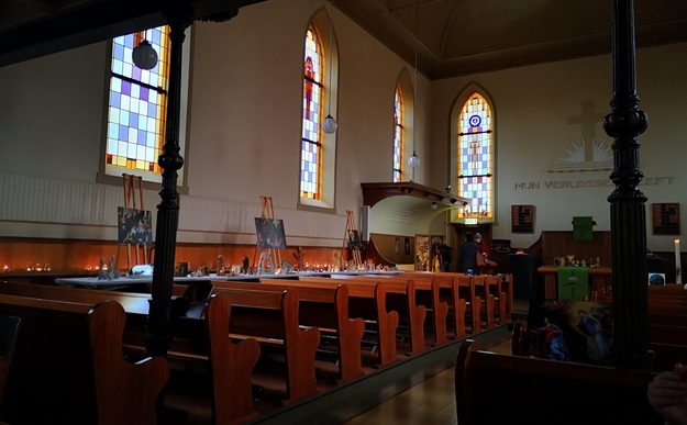 Kerststallententoonstelling in Lutherse kerk uitgebreid met glas-in-lood, schilderkunst en keramiek