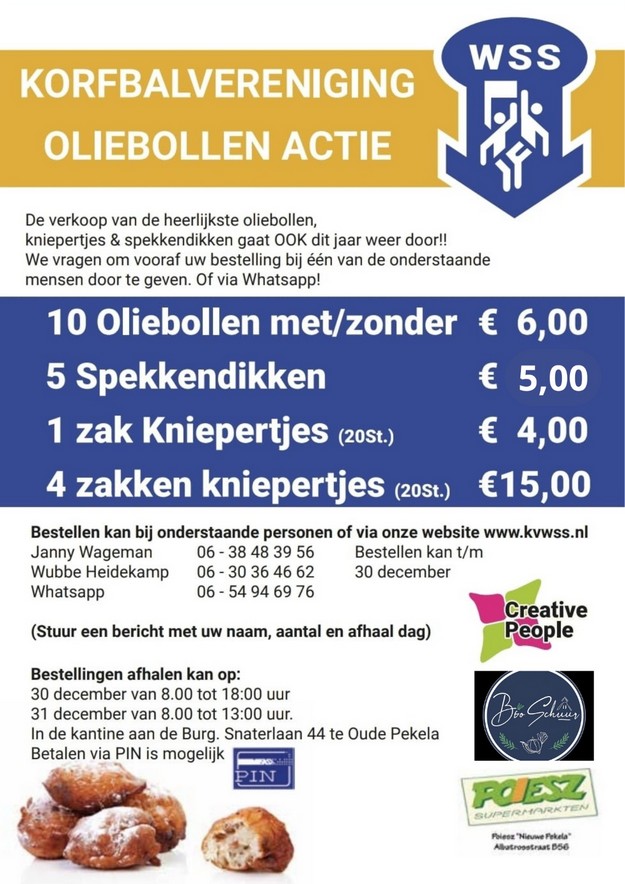 OUDE PEKELA - Het einde van het jaar nadert, en dat betekent dat Korfbalvereniging WSS in Oude Pekela weer klaarstaat met de traditionele oliebollenactie. Ook dit jaar bakken vrijwilligers met veel enthousiasme de lekkerste oliebollen, spekkedikken en kniepertjes voor de hele gemeente. In de komende dagen worden de flyers door leden van de vereniging huis-aan-huis verspreid, maar bestellen kan nu al.