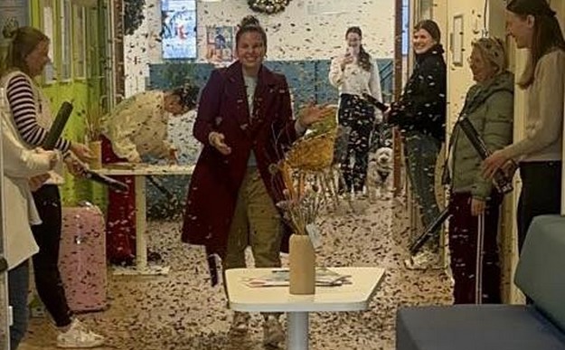 Halverwege de dag werd Marinka op de Fyzigo-locatie in Nieuwe Pekela opgehaald in een opvallende roze Cadillac uit 1956, compleet met chauffeur. De rit bracht haar naar de vestiging in Het Dokhuis in Oude Pekela, waar collega’s haar feestelijk ontvingen. Bij binnenkomst werd ze verwelkomd met confetti, slingers en een gezamenlijke lunch om haar prestatie te vieren.