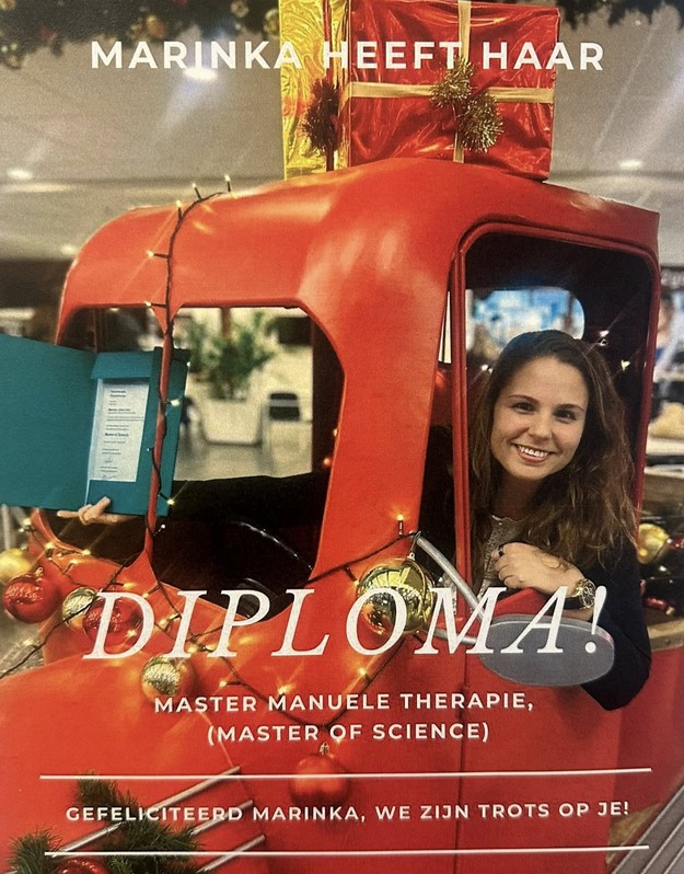 PEKELA - Bij Fyzigo in Pekela was het deze week feest. Fysiotherapeut Marinka Veld heeft haar driejarige Masterstudie Musculoskeletale Therapie met succes afgerond. Afgelopen maandag vond de diploma-uitreiking plaats in Enschede, en een dag later stond haar eerste werkdag als Master of Science Manueel Therapeut in het teken van een bijzondere verrassing.
