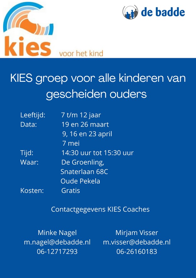 PEKELA - KIES is een groepsprogramma van 6 a 7 bijeenkomsten met spel en creatieve werkvormen waar kinderen kunnen vertellen, delen en leren beter om te gaan met de scheiding. Dit kan gaan om een scheiding kort geleden maar is ook zeker fijn en zinvol voor kinderen waarvan hun ouders al lang geleden gescheiden zijn, omdat er steeds weer nieuwe veranderingen zijn.