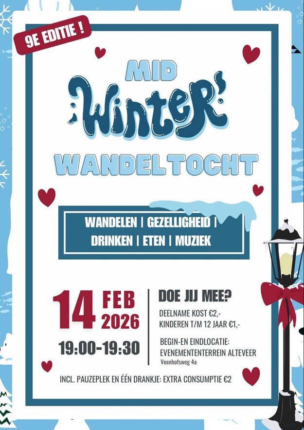 PEKELA / ALTEVEER - Op zaterdag 14 februari 2026 staat Alteveer opnieuw in het teken van beweging en gezelligheid tijdens de 9e editie van de Midwinter Wandeltocht. Het evenement combineert wandelen met sfeer, muziek, eten en drinken en belooft opnieuw een warme winteravondactiviteit te worden voor jong en oud.