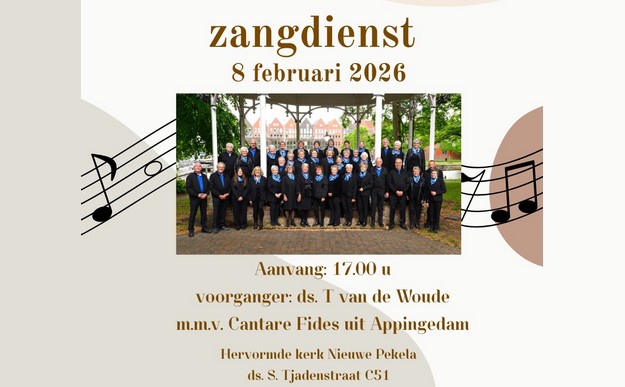 NIEUWE PEKELA - In de Hervormde Kerk van Nieuwe Pekela wordt op zondag 8 februari 2026 een bijzondere zangdienst gehouden. Tijdens deze dienst staat samenzang centraal en verleent het koor Cantare Fides uit Appingedam zijn medewerking.