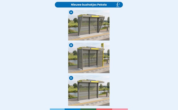 Van 9 tot en met 16 maart kunnen inwoners hun stem uitbrengen via de online enquête op www.pekela.nl/vragenlijstbushokjes. Inwoners kunnen kiezen uit drie verschillende ontwerpen. Op basis van de uitkomsten van de enquête wordt het meest populaire type gekozen.