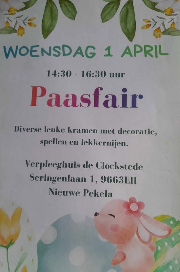 NIEUWE PEKELA - In verpleeghuis De Clockstede wordt op woensdag 1 april een gezellige Paasfair georganiseerd. Bezoekers zijn van harte welkom tussen 14.30 en 16.30 uur om de fair te bezoeken.