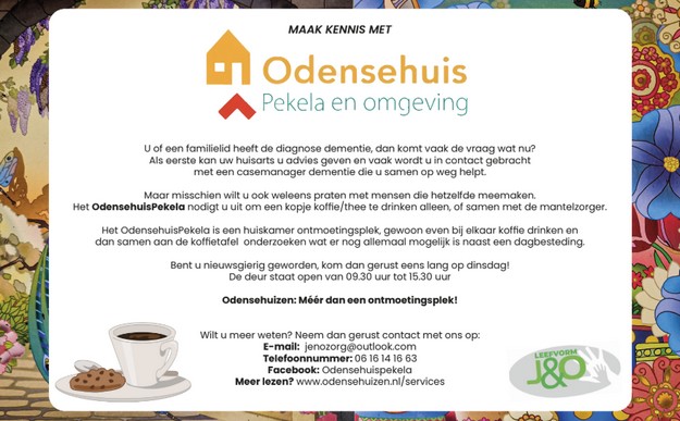 Iedereen die met dementie te maken heeft, is welkom om eens langs te komen voor een kop koffie en een kennismaking. De organisatie vraagt wel om vooraf even contact op te nemen via telefoonnummer 06-16141663 of per e-mail via jenozorg@outlook.com