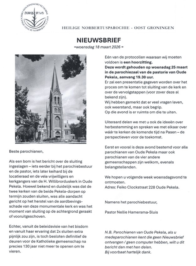 OUDE PEKELA - Inwoners en parochianen krijgen binnenkort de gelegenheid om hun mening te geven over de toekomst van de kerk in Oude Pekela. Op woensdag 25 maart wordt een hoorzitting gehouden waarin uitleg wordt gegeven over het proces rondom de voorgenomen sluiting van de kerk en de stappen die daarna volgen.