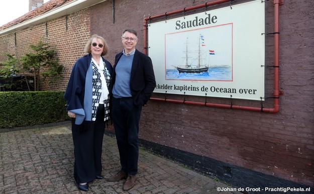 Aan de buitenmuur van het museum onthulden zij een groot canvasdoek met daarop het schip De Meeden, afgebeeld in de Braziliaanse havenstad Bahia. De titel Saudade verwijst naar een Portugees woord dat een gevoel van heimwee en verlangen uitdrukt — een begrip dat goed past bij de lange zeereizen van de Pekelder kapiteins.