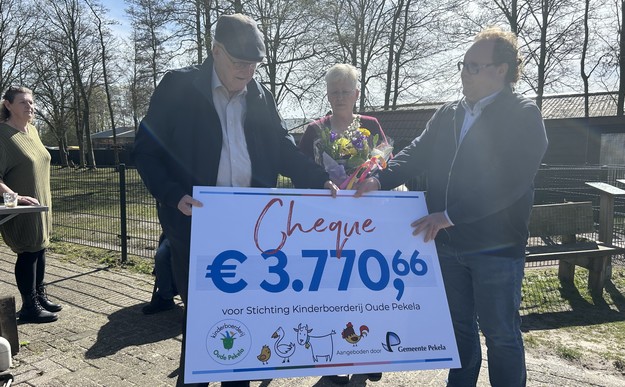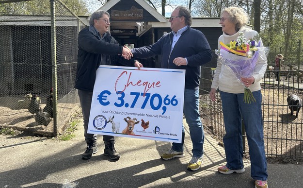 PEKELA - Burgemeester Jaap Kuin overhandigde vandaag (woensdag 8 april) waardecheques aan de Kinderboerderij in Oude Pekela en de Dierenweide in Nieuwe Pekela. Op deze cheques stond het bedrag dat zij ontvangen uit de opbrengst van de verkoop van de oude lantaarnpalen, die eerder aan de landszijde van het Pekelder Hoofddiep stonden.