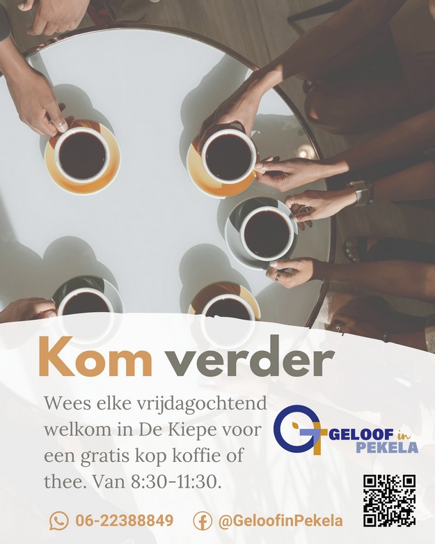 NIEUWE PEKELA - Vanaf morgen, 10 april, is iedereen elke vrijdagochtend welkom in de Kiepe voor een gratis kop koffie of thee. Geloof in Pekela organiseert deze inloopochtenden als een plek waar je anderen kunt ontmoeten, even kunt bijpraten of het gesprek van het schoolplein rustig kunt voortzetten. Of je nu alleen komt of samen, druk bent of juist tijd over hebt: je bent van harte welkom. Van 8:30-11:30 staat de koffie of thee voor je klaar in de Kiepe: Kom Verder! (Meer info: 06-22388849)
