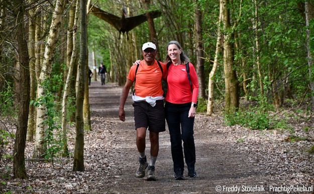 Een bijzonder onderdeel van de tocht was de passage door Dinopark Tenaxx. Hier liepen wandelaars tussen levensechte dinosaurussen, wat bij veel deelnemers voor enthousiaste en verrassende reacties zorgde.