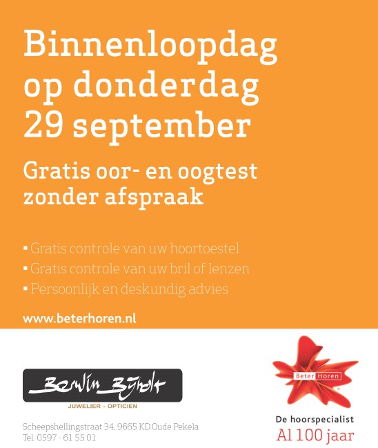 Berwin Bijholt Opticien en Beter Horen dragen professionaliteit en deskundig advies hoog in het vaandel. De opticiens en audiciens werken met de modernste apparatuur, bieden een ruime keus uit topkwaliteit A-merken en adviseren graag over een oplossing op maat; van merkbril tot onzichtbaar hoortoestel en van gratis nazorg tot slimme accessoires. Tijdens de Binnenloopdag op 29 september aan de Scheepshellingstraat in Oude Pekela, laten ze bezoekers er graag geheel vrijblijvend kennis mee maken.